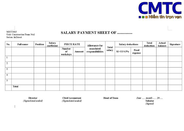 Hình thức trả lương: Lương được tính và được thanh toán bằng chuyển khoản/tiền mặt vào ngày 5 của tháng kế tiếp.