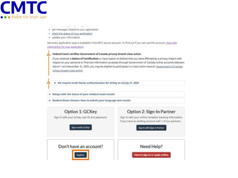 Để bảo mật tài khoản, Chính phủ Canada cung cấp hai phương thức đăng nhập: GCKey hoặc Sign-In Partner. GCKey là một mã bảo mật dành riêng cho mỗi người dùng, trong khi Sign-In Partner là phương thức kết nối với các ngân hàng và dịch vụ khác để đăng nhập. Bạn chỉ cần chọn phương thức phù hợp và nhập thông tin đăng nhập. Nếu chưa đăng ký tài khoản, bạn sẽ được hướng dẫn tạo tài khoản mới.