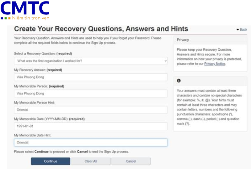 Ở bước này, bạn sẽ tạo bốn câu hỏi bảo mật để bảo vệ tài khoản của mình. Những câu hỏi này sẽ giúp bạn khôi phục tài khoản trong trường hợp quên mật khẩu hoặc muốn thay đổi thông tin đăng nhập. Hãy chọn những câu hỏi mà bạn dễ nhớ, nhưng đảm bảo tính bảo mật cao. Ví dụ về các câu hỏi bảo mật có thể là: “Bạn bao nhiêu tuổi?”, “Tên người thân đáng nhớ nhất của bạn là ai?”, “Bạn sống ở đâu?”. Sau khi hoàn tất, nhấn “Continue”.
