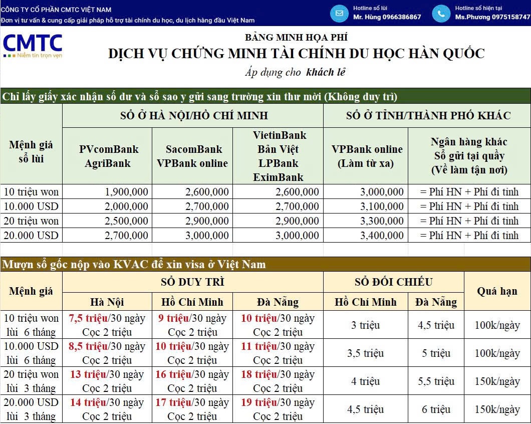 Làm sổ D4, D2 nộp KVAC/gửi sang trường xin thư mời chưa đến 45 phút + Phí dịch vụ chưa đến 500K. Hãy để CMTC Việt Nam đồng hành cùng bạn trên con đường ước mơ du học và cùng tìm hiểu về chứng minh tài chính du học Hàn nhé!