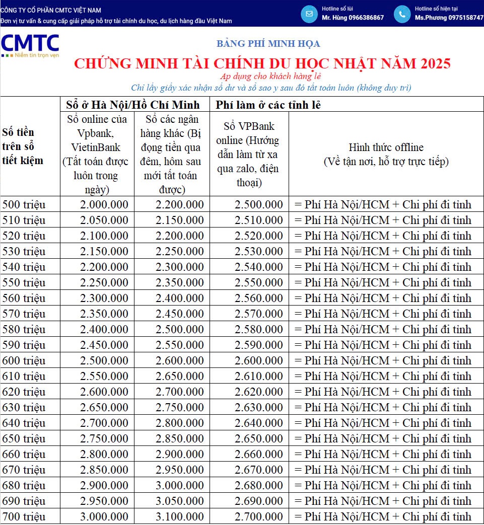 Là đơn vị tư vấn và cung cấp giải pháp hỗ trợ tài chính du học, du lịch hàng đầu Việt Nam, CMTC Việt Nam tự hào có thể cung cấp tất cả các dịch vụ chứng minh tài chính để xin VISA Nhật tại bất kỳ ngân hàng nào và tỉnh/thành phố nào ở Việt Nam.
