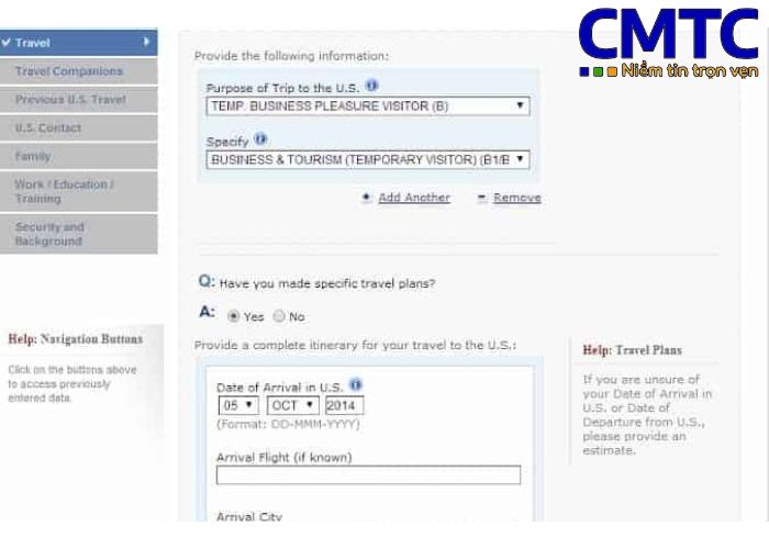 Purpose of trip to the U.S (Mục đích chuyến đi đến Mỹ): Nhập lý do chính của chuyến đi sang Mỹ.