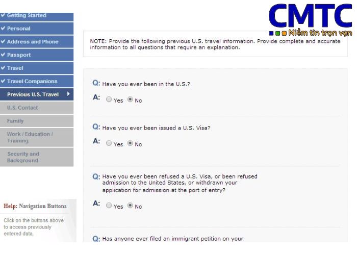Have you ever been in the U.S? (Bạn đã từng đến Mỹ chưa?): Nếu bạn đã từng đến Mỹ, chọn "Yes" và điền thêm thông tin theo yêu cầu. Nếu đây là lần đầu tiên bạn sang Mỹ, chọn "No".