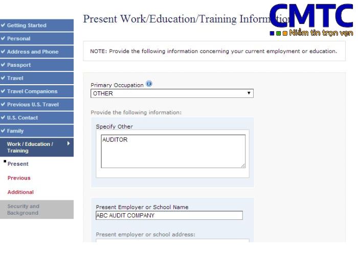 Present Employer or school address (Địa chỉ công ty hoặc trường hiện tại): Điền địa chỉ của công ty bạn làm việc hoặc trường bạn đang theo học.