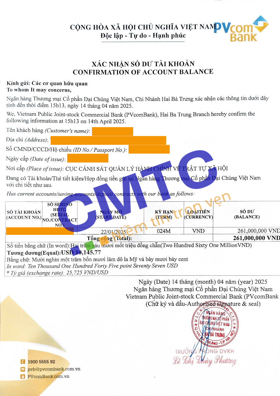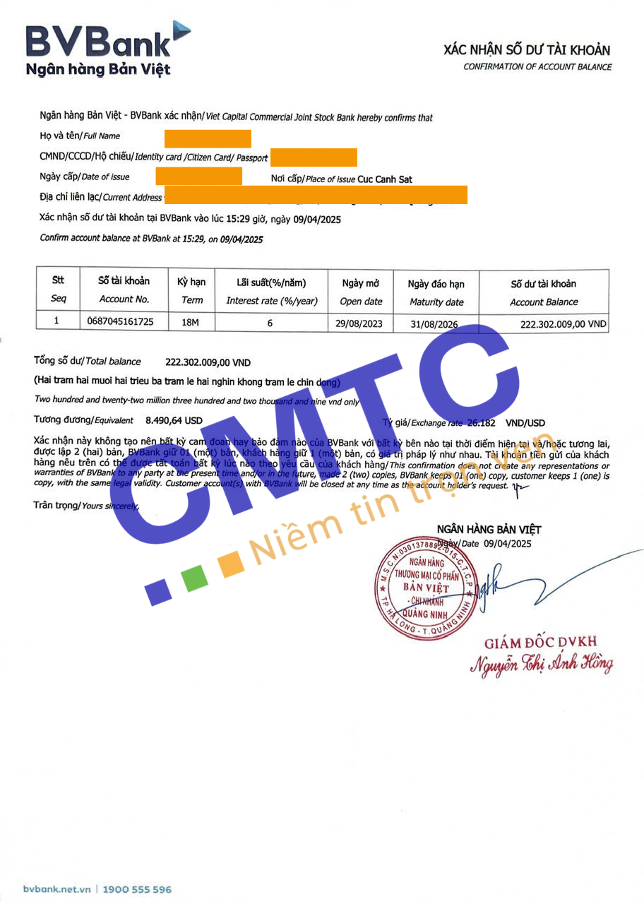 Với đội ngũ nhân viên giàu kinh nghiệm và am hiểu sâu sắc về quy trình chứng minh tài chính, CMTC Việt Nam sẽ hỗ trợ khách hàng từ việc chuẩn bị hồ sơ, thủ tục đến việc tư vấn và giải đáp mọi thắc mắc của khách hàng. Chúng tôi cam kết đảm bảo tính chính xác và đúng đắn của các thông tin được cung cấp, giúp khách hàng tối ưu hóa cơ hội thành công trong việc xin visa hoặc các quy trình nhập cảnh khác.