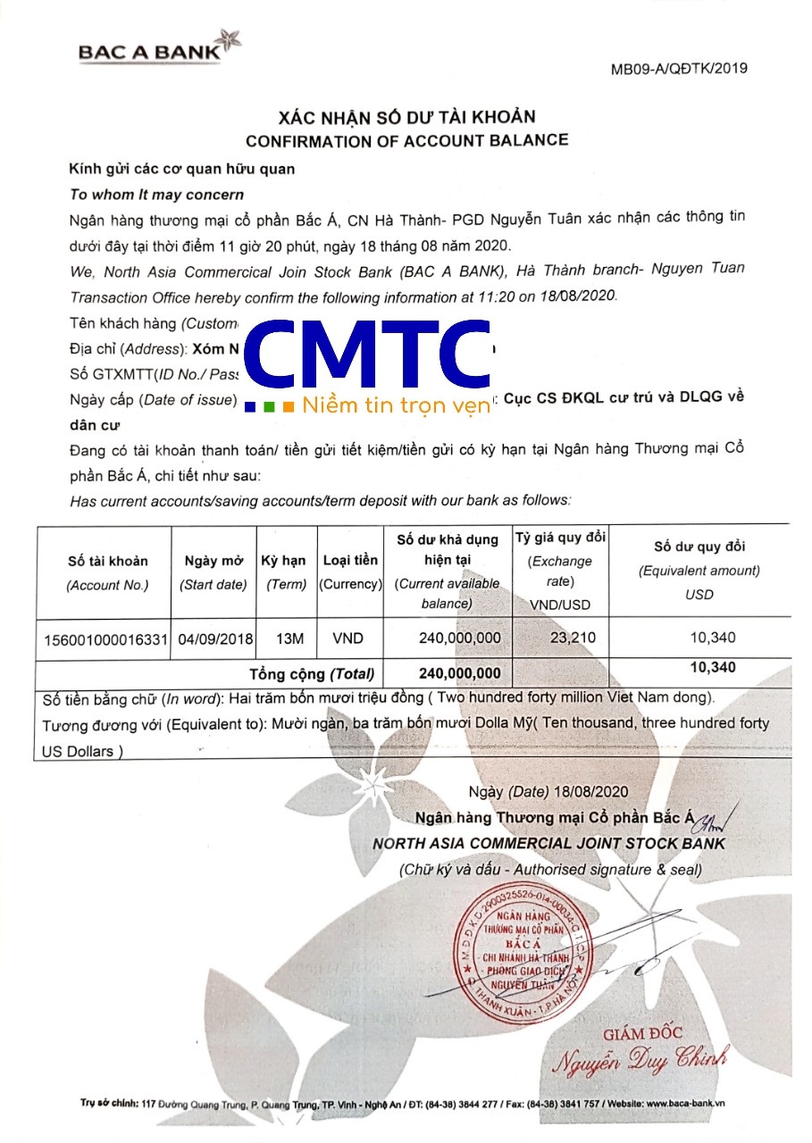Giấy xác nhận số dư Bắc Á Bank (Bản song ngữ)
