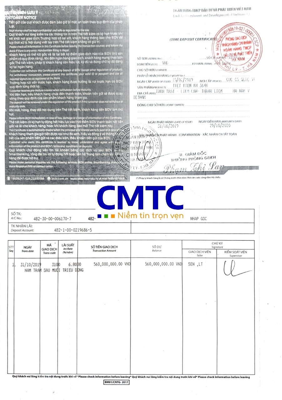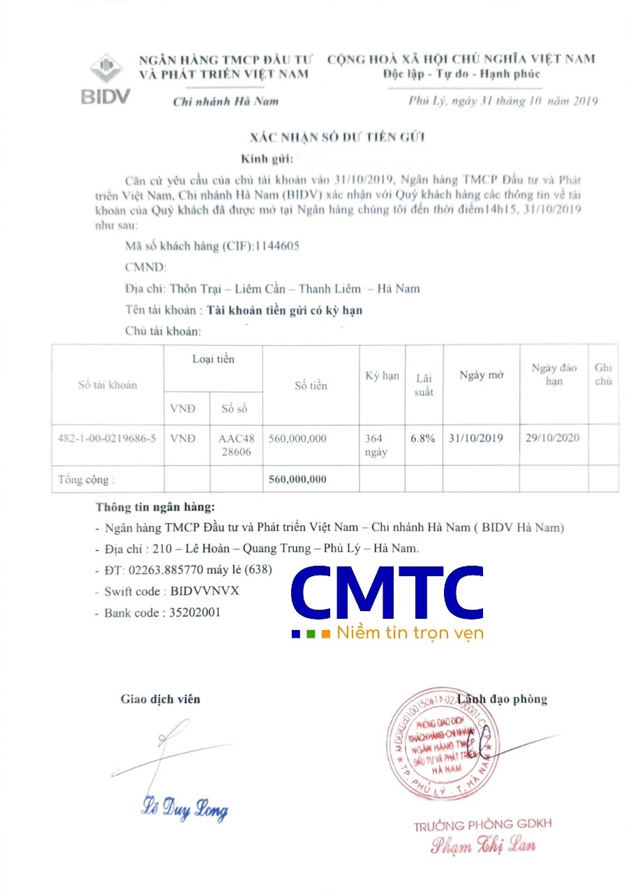 CMTC Việt Nam là đơn vị uy tín chuyên cung cấp dịch vụ làm giấy xác nhận số dư tiền gửi ngân hàng BIDV. Với nhiều năm kinh nghiệm trong lĩnh vực chứng minh tài chính, CMTC Việt Nam cam kết mang đến cho khách hàng dịch vụ nhanh chóng, hiệu quả và đáng tin cậy.
