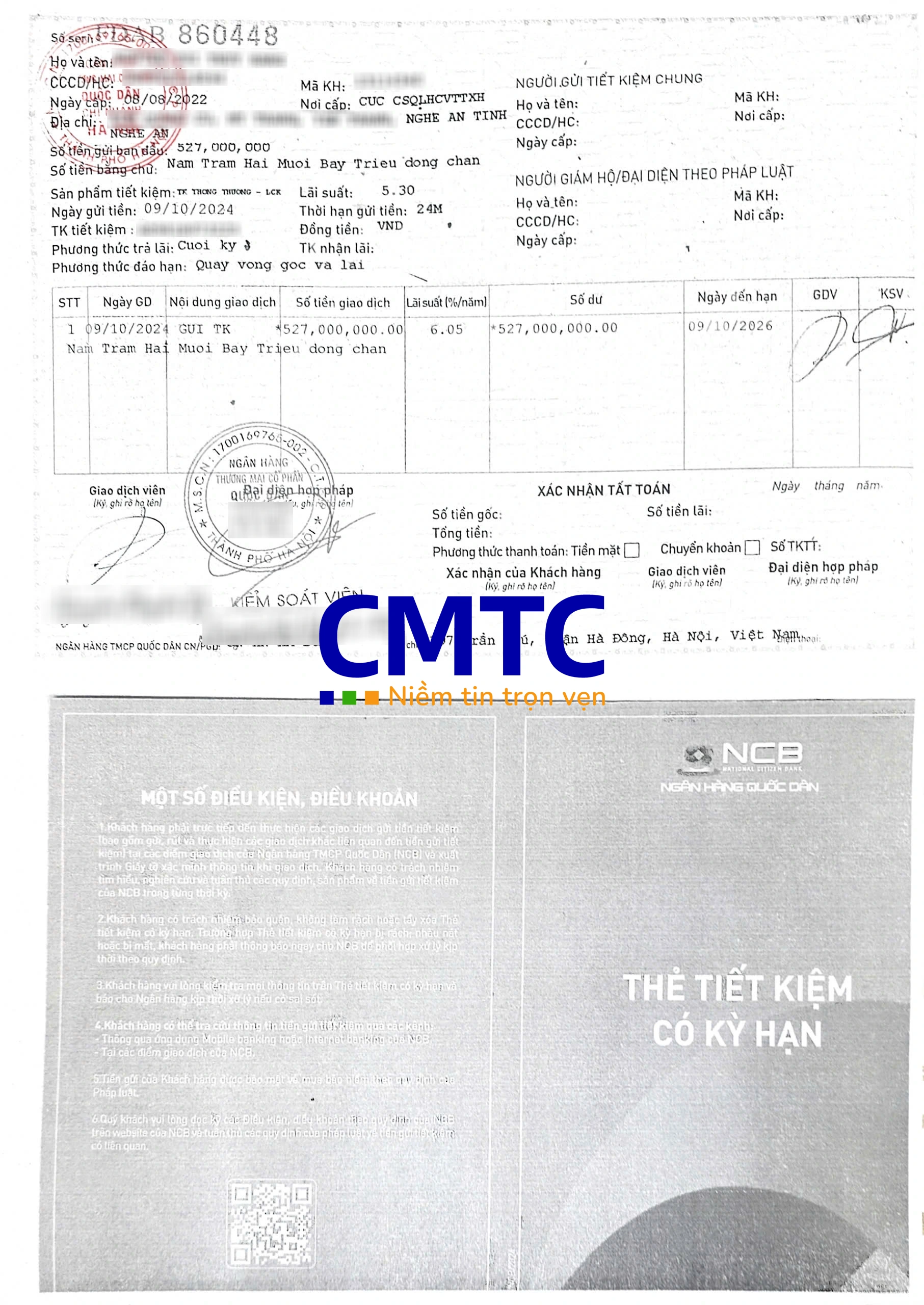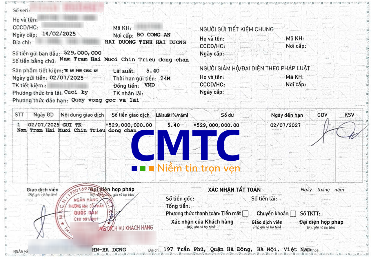 Với CMTC Việt Nam, chúng tôi đồng hành cùng khách hàng trong từng bước thực hiện, từ khâu chuẩn bị hồ sơ, nộp tiền mặt hoặc chuyển khoản đến việc hoàn tất các thủ tục tại ngân hàng. Đội ngũ chuyên viên của chúng tôi luôn sẵn sàng tư vấn và hỗ trợ mọi thắc mắc, đảm bảo dịch vụ diễn ra thuận lợi và hiệu quả. Đến với CMTC Việt Nam để trải nghiệm dịch vụ chuyên nghiệp, uy tín khi mở sổ tiết kiệm tại NCB.