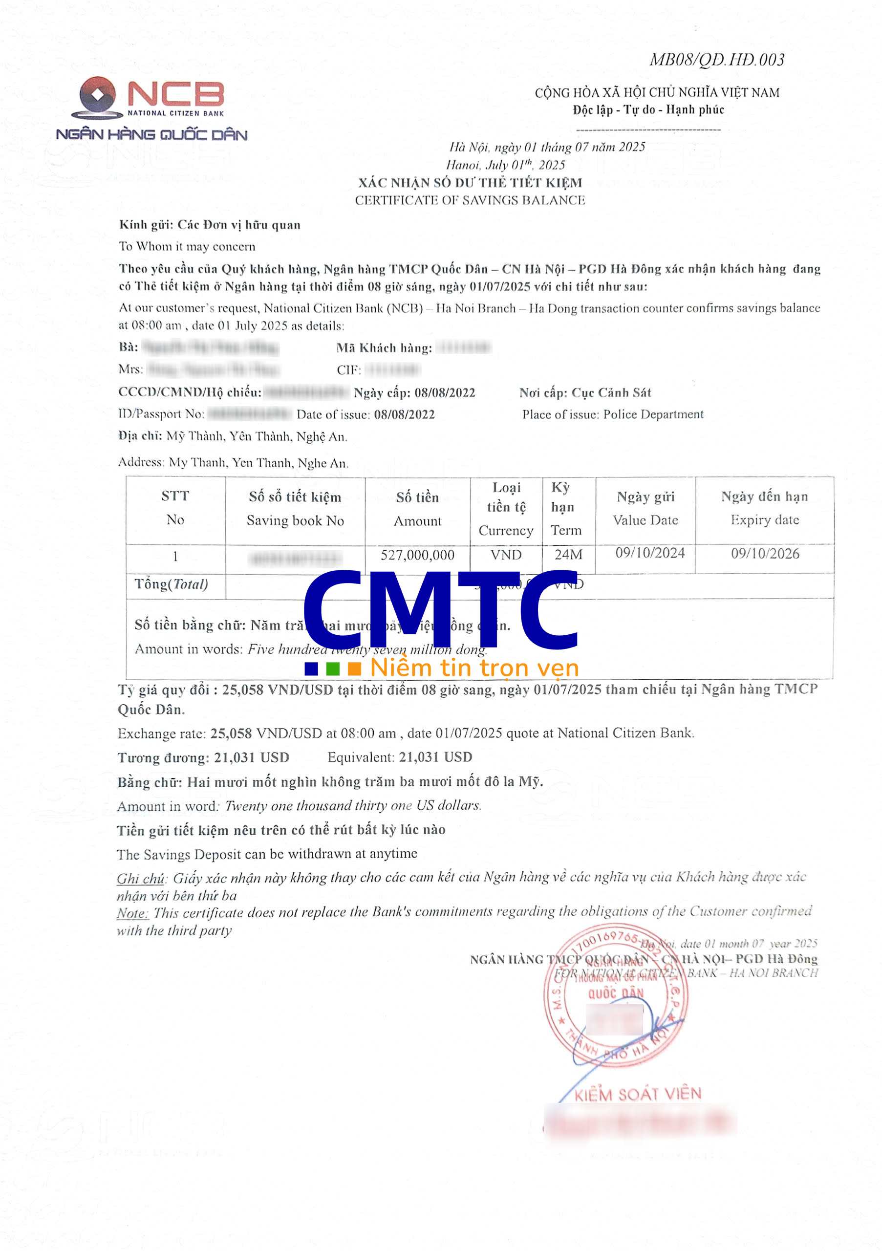 CMTC Việt Nam cung cấp dịch vụ chứng minh tài chính, mở sổ tiết kiệm tại Ngân hàng Quốc Dân (NCB) trên toàn quốc. Hãy liên hệ ngay với chúng tôi để được tư vấn miễn phí!
