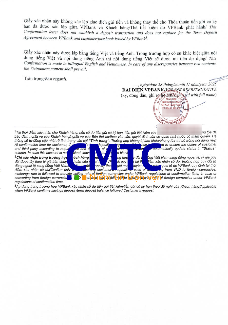 Mặt sau giấy xác nhận số dư ngân hàng VP Bank (bản song ngữ)