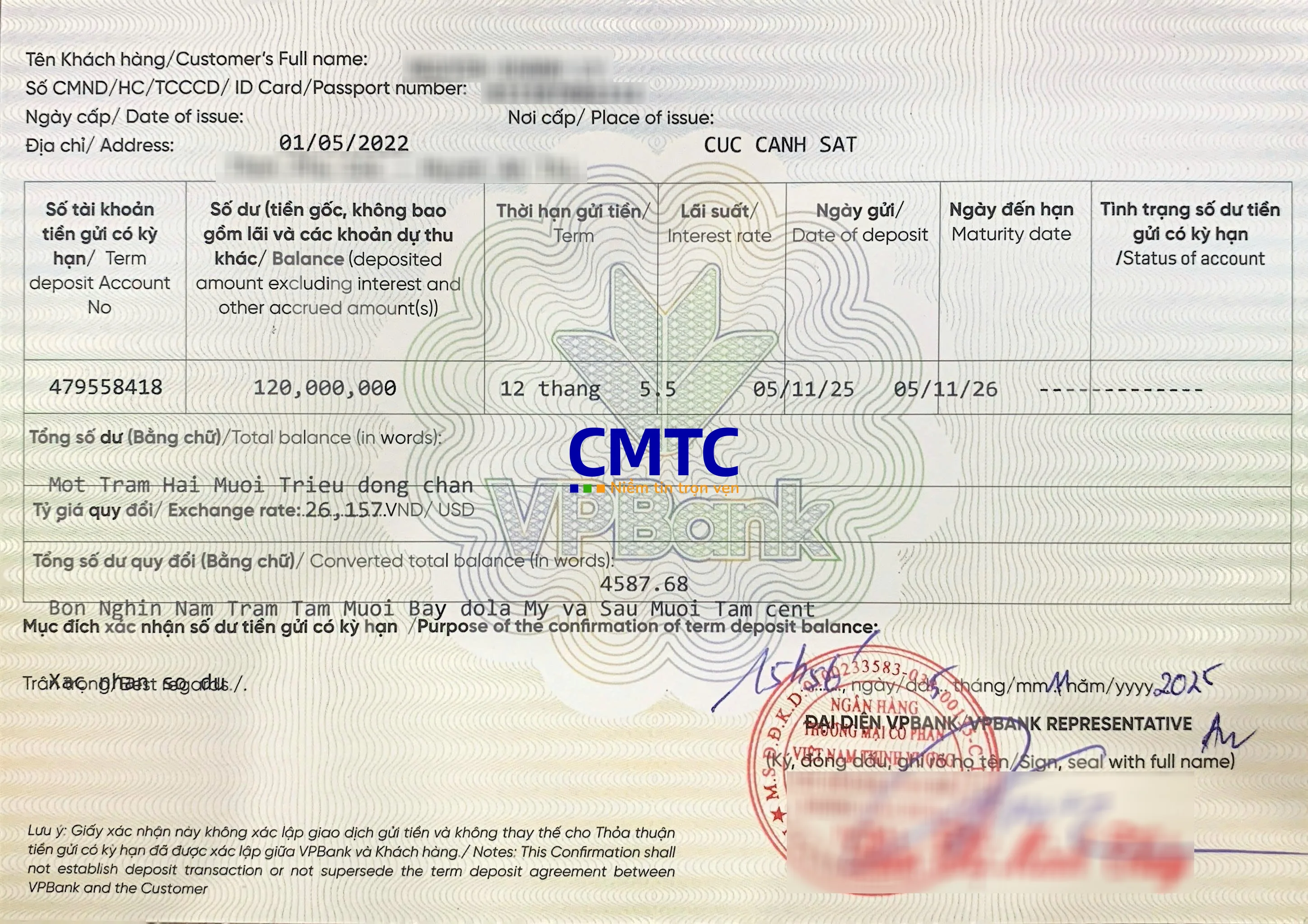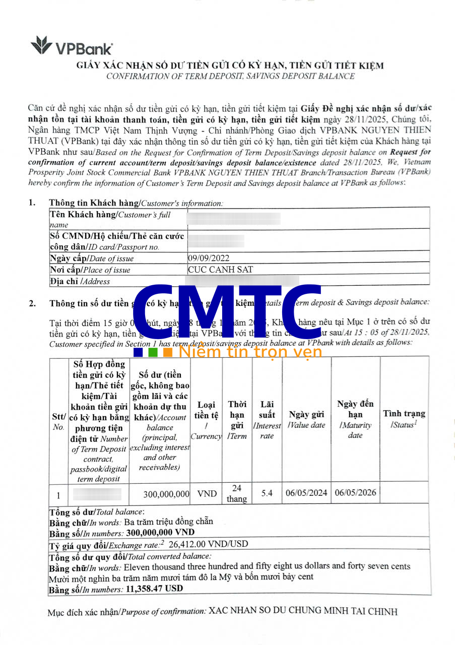 Trong bối cảnh tài chính ngày càng phát triển, việc quản lý thông tin tài chính chính xác và minh bạch trở nên vô cùng quan trọng. Tại Ngân hàng TMCP Việt Nam Thịnh Vượng (VPBank), dịch vụ giấy xác nhận số dư tiền gửi không chỉ giúp khách hàng có cái nhìn tổng quan về tình hình tài chính của mình mà còn là một công cụ hữu ích trong nhiều giao dịch cần thiết. Trong bài viết này, CMTC Việt Nam sẽ cung cấp thông tin chi tiết về Mẫu sổ tiết kiệm và giấy xác nhận số dư tiền gửi ngân hàng VPBank để bạn có thể sử dụng dịch vụ này một cách thuận tiện nhất.