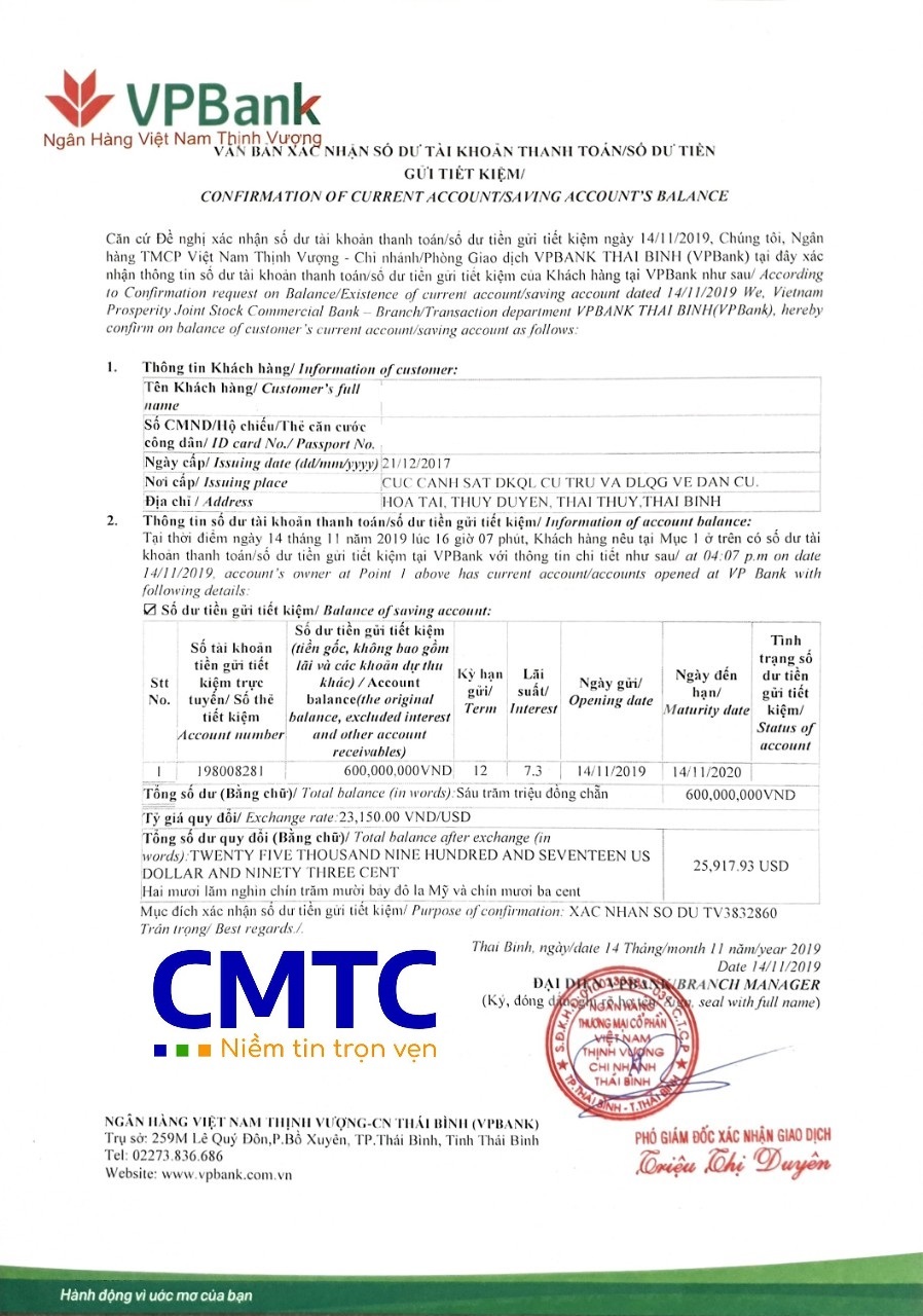 Giấy xác nhận số dư VP Bank (bản song ngữ)