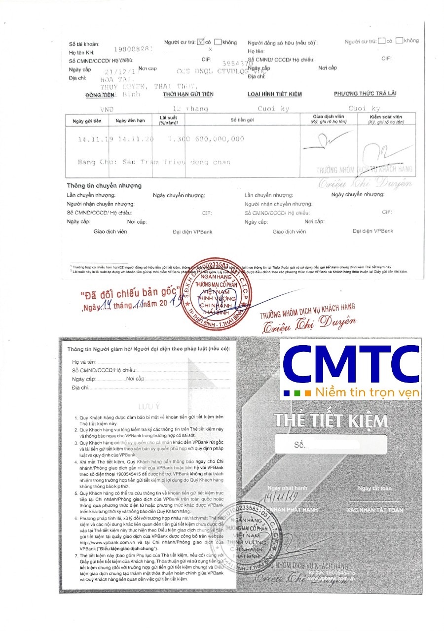 CMTC Việt Nam tự hào là đơn vị chuyên cung cấp dịch vụ hỗ trợ làm sổ tiết kiệm tại ngân hàng VPBank, giúp khách hàng chứng minh tài chính một cách nhanh chóng và chuyên nghiệp. Với nhiều năm kinh nghiệm trong lĩnh vực tài chính, CMTC Việt Nam cam kết mang đến cho bạn sự hỗ trợ tốt nhất trong quá trình chuẩn bị và xử lý hồ sơ tài chính.