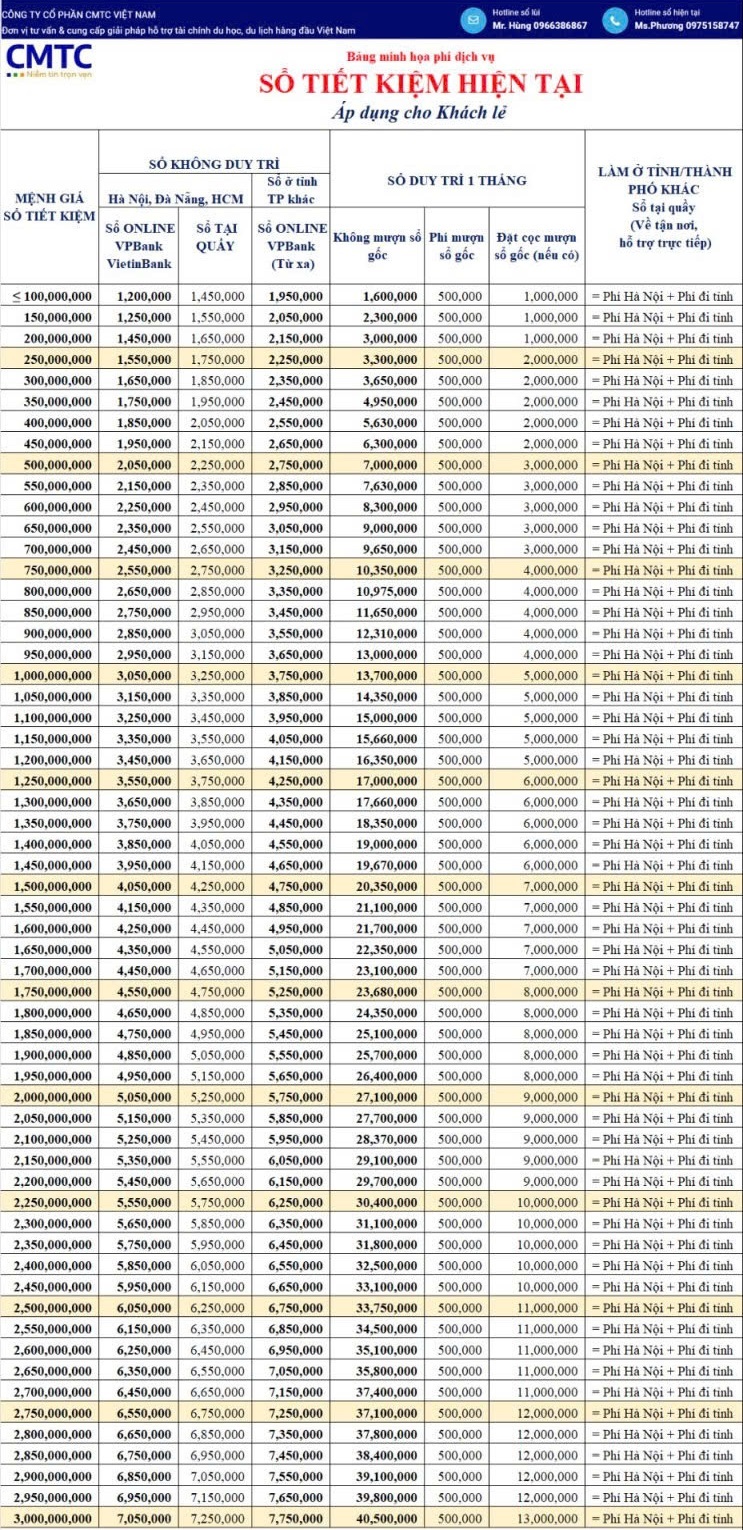 Lưu ý: Đây chỉ là bảng phí minh họa, để biết được mức phí chính xác, bạn vui lòng liên hệ với CMTC Việt Nam để được tư vấn và báo phí chính xác nhất nhé!